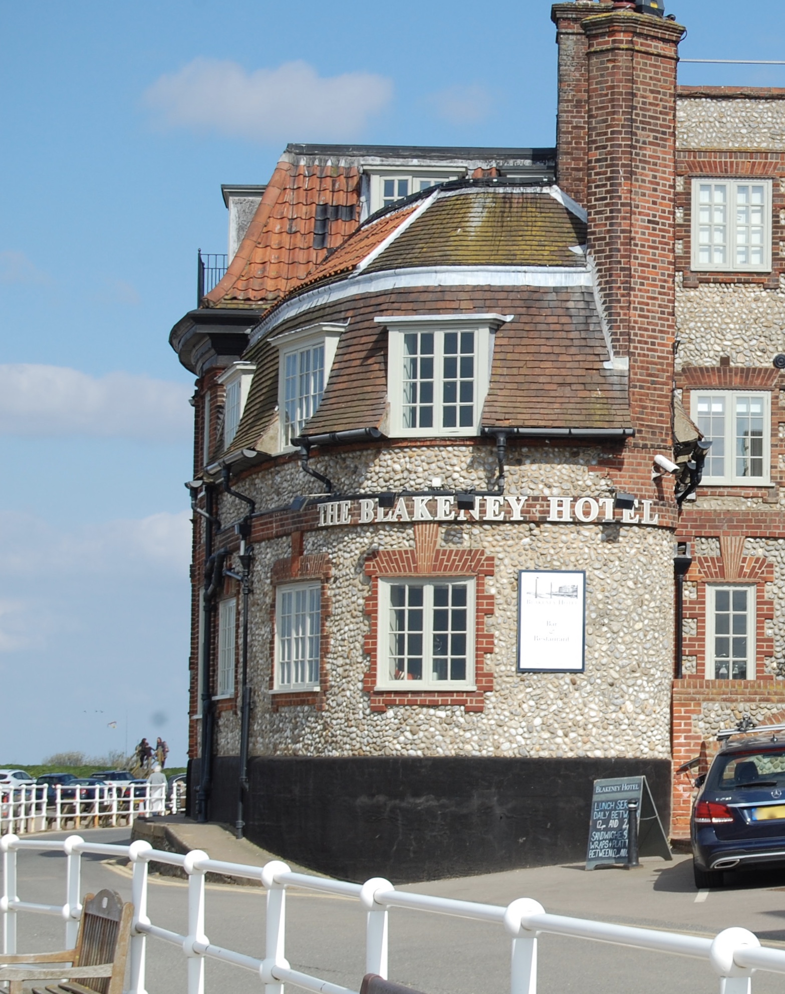 Having looked around the theatre and thanked the school staff for their hospitality, I walked the mile or so into Holt where I met Mrs. P in the Adnams shop: always a welcome sight in an East Anglian town. It was fast approaching lunchtime now, so we drove back out to the coast road and through a series of tiny, coastal hamlets: Kelling, Salthouse, Cley – where London poet Stevie Smith had spent some of her summers. We wound our way along coastal roads between farmland and seemingly endless marshes, stretching to where the shingle bank keeps the sea at bay. We at last arrived at Blakeney, squeezing down narrow lanes between tightly-packed flint houses, to the tiny harbour on the creek, where excited children dangled bright orange crab lines into the water.