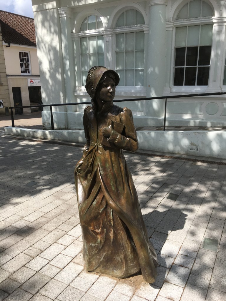 In the house, I Saw the dining table, around which the entire Austen family gathered and a fine exhibition of the books that Jane read or talks about reading. As they all came from Chawton House library and the Knights’ own collection, some of them would have been the actual editions she knew. Again, I had to miss the garden as it was too wet to look around outside; there is a great landscaped garden and a trail around it. I was able to visit St. Nicholas church, however. A tiny little church in the grounds of the house, where the Austen family came for worship. There is a charming little statue of Jane in the churchyard and the graves of her mother and sister.