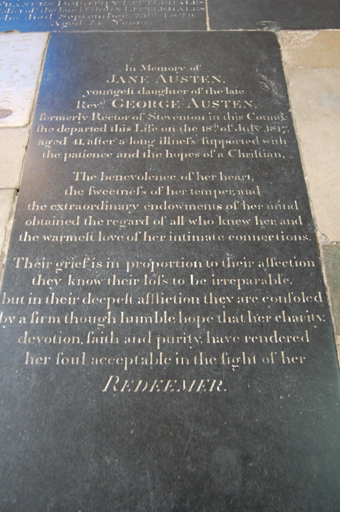 The cathedral is, of course, a magnificent building: large and stately. I approached just as a light drizzle was beginning to fall, so it would be good to get inside for an hour. There was no mistaking Jane Austen’s grave: there was a large group of people gathered around as I approached. Three of them were standing on the stone itself. They were having an intense conversation so I hung back: they were probably discussing Austen and having a ‘moment’ at her graveside, so I waited, camera at the ready, to capture this important literary site. I looked around the displays they have to tell you the story of her life, at the memorial plaque, installed by her Nephew, Edward, who didn’t consider the stone a fitting tribute to a great writer, and at the window, installed by public subscription, for those who didn’t consider the plaque a fitting enough tribute to great writer. I returned to the grave and was slightly surprised to discover the three young people still standing there. Other people were coming and going and looking at the grave before moving on. These three were standing on the gravestone itself, involved in an intense conversation. I waited, camera at the ready, to make it clear that I would like some time at the grave myself. But still they did not move. I was now close enough to hear their convesation and they were talking about… what was it? it didn’t seem to be any story I recognised. It was about a small community in London, based in a square in the East End. Definitely not one I know, one of her unfinished novels perhaps? No, they were discussing Eastenders! Eventually, after some tutting, coughing and shuffling, they noticed my dissatisfaction with their utter selfishness and drifted away to conduct their discussion elsewhere. Now I was able to have my own moment at Austen’s grave.