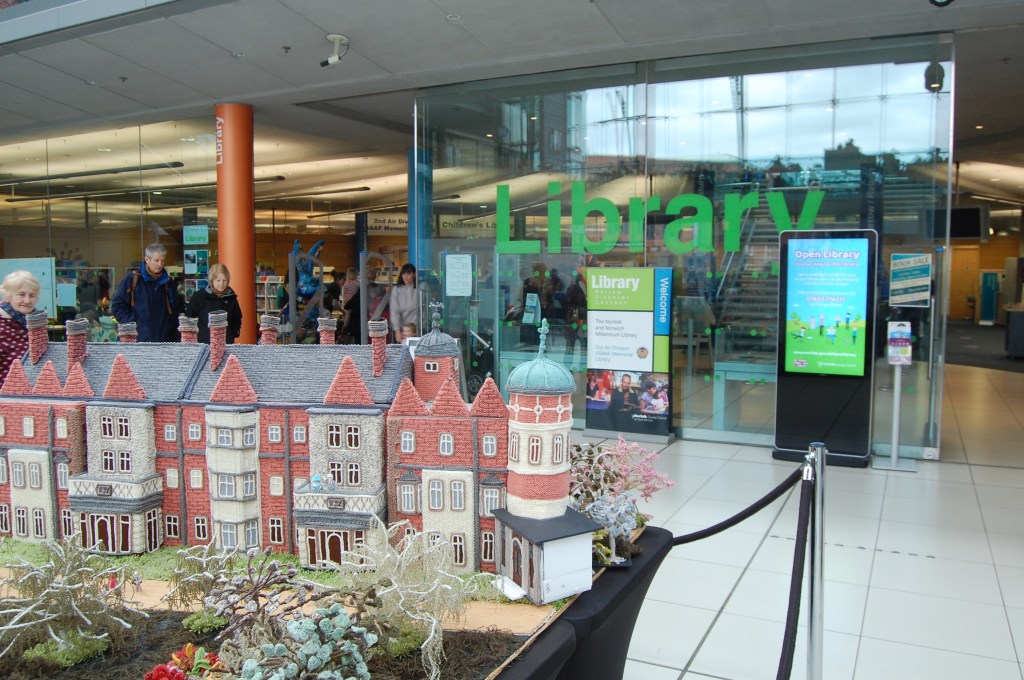 It was busy. As well as the library there is a Pizza Express, a coffee shop, a citizens’ advice bureau and a tourist information office. There was an exhibition of knitting in the foyer. Hundreds of Norfolk grannies had been putting needle to wool in aid of charity and the fruits of their labours where there for all to see. I stopped in front of a magnificent model of Sandringham House, all constructed from wool, complete with wooly trees and wooly royal family. Inside the library there were three floors of books, a local history research centre, a small business advice centre. They have exhibitions and talks throughout the year. Oustide the building is a performance space. Everywhere there were children: families with toddlers, older children doing research for school projects (one very eager girl researching gay history with her bemused and embarrassed looking grandfather); kids swarming between the shelves searching for books to help them pass the holidays. This is what libraries should be like. Not quiet and dusty shelves with grumpy librarians but vibrant places of entertainment, fit for a family day out. I was extremely impressed.
