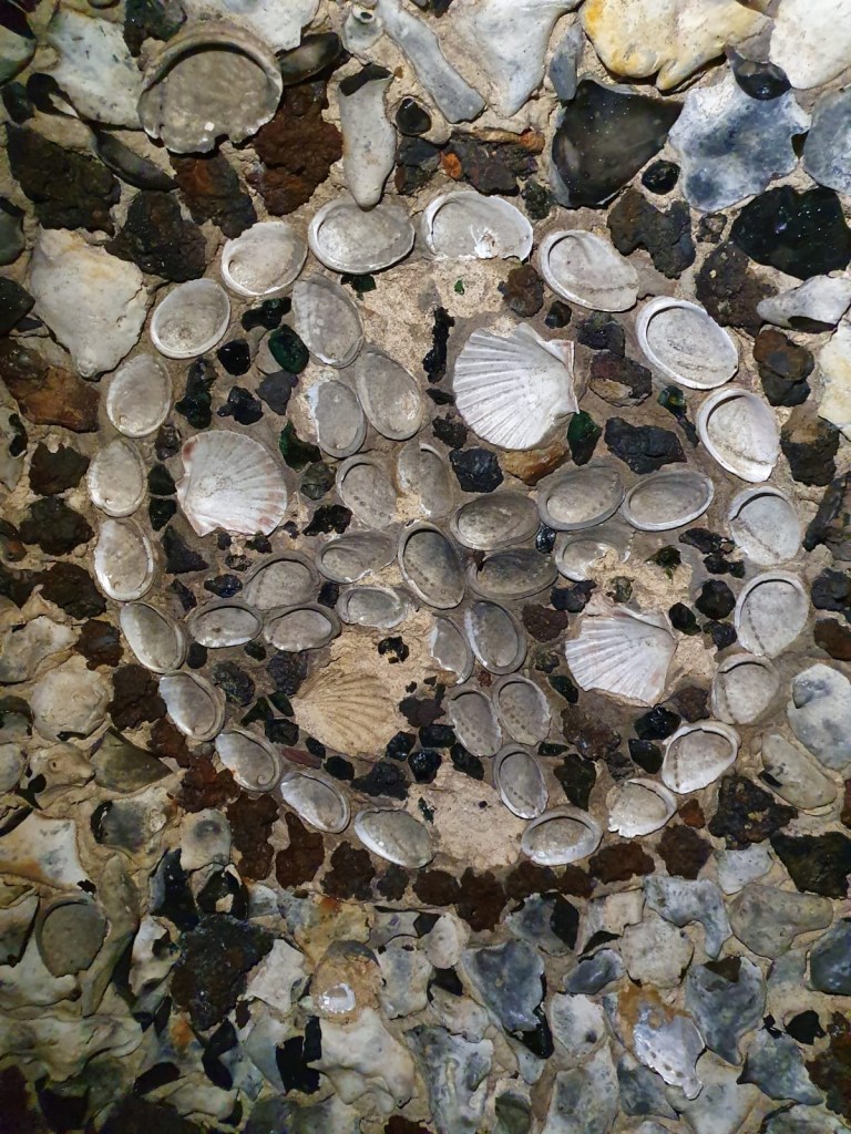 On entering, you are transported into a magical underground grotto. The floor, and the walls are stone, interspersed, here and there with flints, fossils, shells and gemstones and they appear to sparkle. The objects are arranged in a variety of patterns: wheels, hearts, geometric shapes, theres even a face or two. From the porch, passages lead to left, right and straight on into the hillside. On venturing further underground chamber, the light becomes dimmer and the quality of sound changes. It’s a very strange experience and conversations are difficult: you can’t see the person you’re talking to and can’t locate their voice, which seems to come from all around you. There are various shafts and passages designed to bring air and light into the deepest parts of the cavern, but it would be impossible to navigate without a light source of some sort. We used the lights on our mobile phones but there are some torches you can borrow.