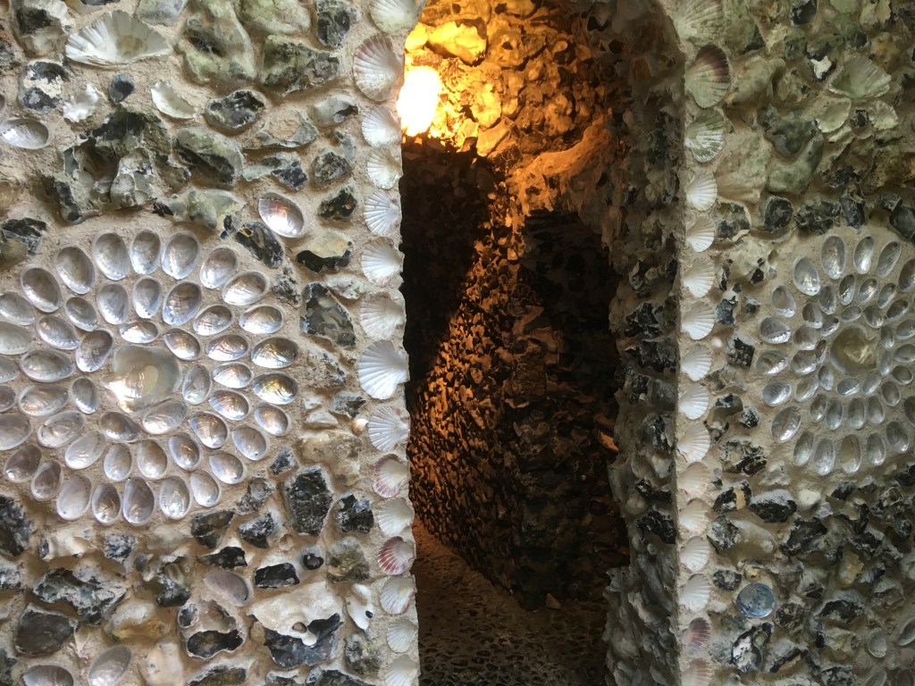 The various chambers in this underground wonderland have been given names reminiscent of a medieval court: The council chamber and robing room, for example. The grotto was built shortly after Scott inherited the property in 1768. It extends 67 feet into the hillside and no one is really sure why he built it. It did attract thousands of visitors however, among them Dr. Johnson, who commented that only a poet could have built it (even though he considered Scott to be a “middle-rate poet”). There was a guide at the grotto, who met us in the final chamber – the council chamber – and told us a little of the history, while pointing out various interesting items in the wall: a nacreous oyster shell, a clay pipe set into a face composed of stones and the word “Frog” spelled out in shells (a tribute to Scott’s wife, Sarah Frogley).