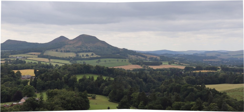 We stopped at a local landmark known as ‘Scott’s View’, more-or-less midway between Scott’s home at Abbotsford and his grave at Dryburgh. There was quite a crowd there: people chatting and laughing and getting in the way of a good photograph while they enjoyed Sir Walter Scott’s favourite view, over the river tweed to Melrose and the Eildon Hills. He stopped here so often that his horses began to halt of their own accord. They stopped again as they carried their master’s body to Dryburgh,to give him one last look. A soppy story, I know, probably not true but fittingly romantic.