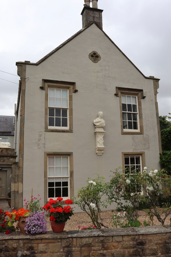 We had already stopped in Kelso, where Scott went to School. The building you can currently see, to one side of the churchyard, dates from 1878, a hundred years after Scott had attended, but a plaque still proudly proclaims Scott as an alumnus. There is a small enclosure at the side of the school, in which some of the Scott family are interred. He stayed in his aunt Janet’s house (across the car park from the school), which now carries a bust of the poet.