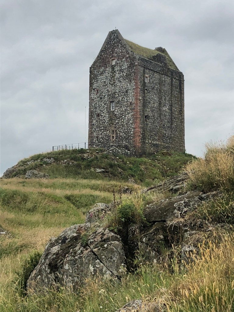 Sandyknowe is not really on the road to anywhere now. You can see it (or rather, the tower on the hillside above it) rising above the surrounding landscape for miles around. If you want to take a look, the road goes through the farmyard, right past the front door of the farmhouse. The best view, however, is to be had from Smailholm tower, that looks down on the farm from the hill above. As we were traversing the country this summer, travelling from Alnwick to Dumfries, we detoured to take a look.