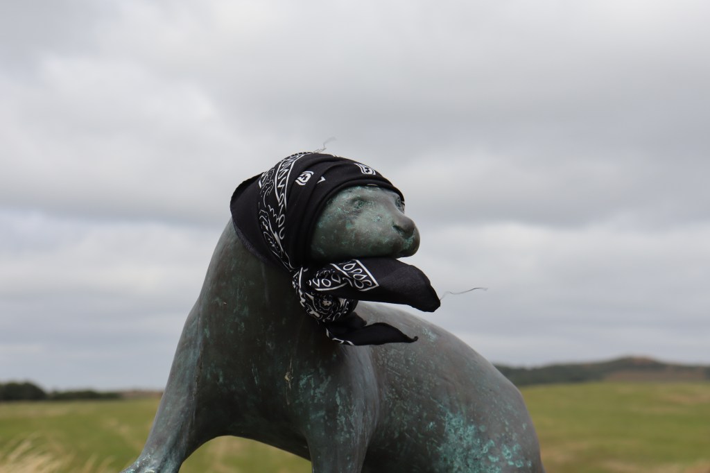 High on the cliff top above the St. Medan golf course, is one of the nicest memorials to an author I’ve ever seen. A statue of Mij in bronze looks out to sea. It is in a lovely spot and we spent a while here, taking it all in. Mrs. P amused herself by taking photographs of the otter in whatever headgear she could fashion from what we had with us.