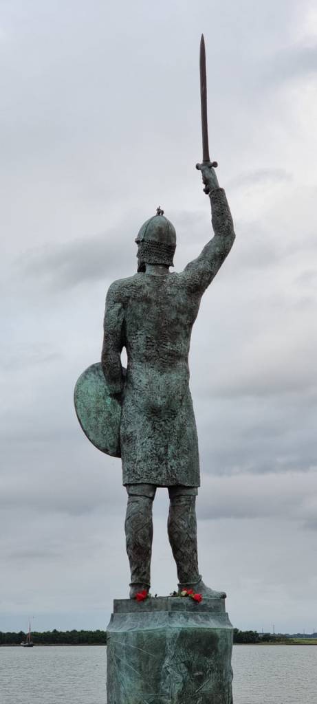 There is a statue of Earl Byrhtnoth, the Saxon chief, in Maldon, in what is clearly a popular spot for locals to walk dogs or just to sit and contemplate the dark river and the endless marshes. It was only a week since 10th August, the anniversary of the battle, and some red roses had been left at the base of the statue. Why red roses, I don’t know. Fen violets or Columbine would have been a better choice, as you can see these throughout the marshland. I doubt that red roses, adopted as a national symbol in 1485, would have held any meaning for Byrhtnoth at all. I wondered what motivated someone to commemorate the death of a thousand year old chieftain and hoped it was not indicative of a growing wave of post-Brexit Nationalism. Any modern Essex dweller is just as likely to be descended from Vikings as Saxons, and I concluded, then, that it was a poetry lover, commemorating the nascence of that epic poem with a symbol of Burns and the Romantic era.