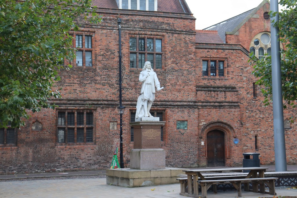I walked past the huge, imposing Minster church. Gothic honey-coloured spires, soaring over the surrounding red brick. I had, partly due to spending a large part of the afternoon in pubs, missed opening for the day, but I could still marvel at the impressive structure. Talking of marvelling, Andrew Marvell’s father worked in the minster as a lecturer: a now obsolete role equivalent to an assistant curate. Outside the Minster is a little square, bounded on one side by the old Grammar school, once attended by Marvell and, later, by William Wilberforce, and now a local history museum. There is a large statue of Marvell in the square, commemorating his political acheivements, rather than his poetry, it does have a verse from his most famous poem.