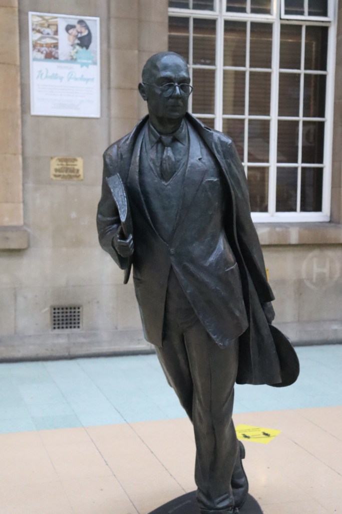 Inside the station is what I’ve really come here to see: the marvellous statue of Larkin by Martin Jennings. I’ve previously admired several examples of Jennings’s work, particularly John Betjeman at St. Pancras Station and Charles Dickens in Portsmouth. In this one, inspired by The Whitsun Weddings, Larkin appears to be in a hurry, leaning forward as he rushes for his train. It’s difficult to know what Larkin thought about Hull. He was rude about it, calling it a ‘dump’ and a ‘hole’, but then, he was rude about everywhere. He also refers to it as “my lonely Northern daughter”, so it seems to have been somewhat of a ‘love-hate’ relationship. Whatever he thought, Hull and Larkin are inextricably linked, a marriage exemplified by the statue at Hull Paragon Interchange. In the Whitsun Weddings, Larkin travels away from the city, observing the world through his open train window: