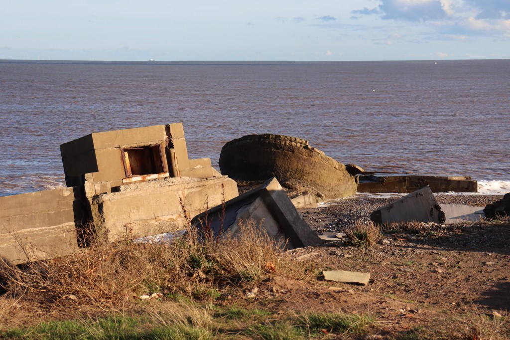 Tolkien suffered a further relapse and was set to yet another military hospital. This time, a little further down the coast at Kilnsea, near the mouth of the Humber. This one was attached to the Godwin Battery, where, as the name suggests, there were huge, heavy cannons guarding the gateway to the Humber estuary. The army was also playing with giant listening devices, in the form of concrete dishes which were designed to concentrate and amplify the sound of incoming aircraft. Eventually, the military gave up with the idea of trying to hear incoming aircraft and started messing around with radio waves. These would eventually develop into Radar systems but, in 1914, experimentation with sonic mirrors was the way forward. There are still some military buildings on this site, absorbed into the caravan site that now occupies the low cliffs here. On the beach is a jumble of concrete blocks and structures that stood on the cliff before it was undermined by the sea. Apparently, one of the listening devices is still visible in a nearby field but, after my short walk along the clifftop, I failed to find it.