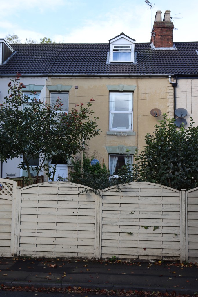 I must say that Hornsea was looking far from its best when we arrived, on a miserable October morning. Wet, grey and drear. I could see caravan sites and amusement arcades, half hidden by a grey, dreary drizzle. We looked around the seafront for a bit: there was a little shop there and a fountain, in case residents and visitors felt that a bit more water was needed. We found Edith’s lodgings quite easily: a nice little terraced cottage with a dormer declaring accommodation on three floors. It was mostly hidden behind trees and tall garden fence but the plaque still visible from the road. Everything, of course, looks better in the sunshine, and by the time we left Hornsea, the rain had stopped, blue patches were appearing overhead and the sun was beginning burn through the clouds.