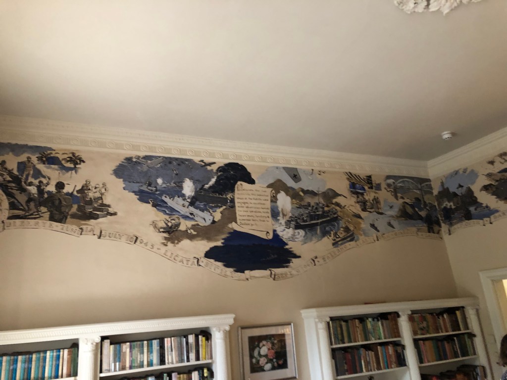 The room I was looking forward to most was the library, complete with its military mural. The building was requisitioned by the US army during the Second World War and they painted a regimental mural on the library wall. On leaving the house, they offered to paint over it, restoring the room to its original decoration but Christie insisted it stayed.